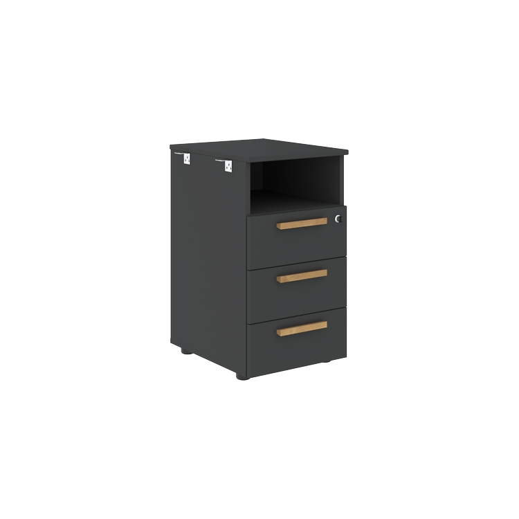 Тумба приставная с открытой нишей и ящиками из ЛДСП т.18 мм, с кромками ABS т.2 и 0,45 мм, комплектуется центральным замком, регулируемыми опорами шкафной группы 50х27 черного цвета. Ящики-фолдинг и дно белого цвета.