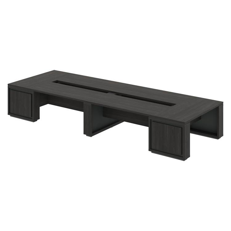 Столешницы, фронтальные панели, верха, низы и бока опор выполнены из ЛДСП Дуб Шерман антрацит 38 мм, облицованы противоударной кромкой ABS 2 мм. Соединители стола выполнены из ЛДСП Дуб Шерман антрацит 18 мм, видимые торцы облицованы противоударной кромкой ABS 0,8 мм. Соединители крайних опор выполнены из ЛМДФ Зеленый камень 18 мм с поверхностью PerfectSense Matt с лицевой стороны. Соединители средней опоры выполнены из ЛДСП Зеленый камень 18 мм. Опоры установлены на цоколя из ЛДСП 38 мм, облицованные противоударной кромкой ABS 2 мм в цвете Зеленый камень. Между столешницами и опорами - проставки из ЛДСП 8 мм, заглубленные на 4 мм от краев столешницы и опор, и, облицованные противоударной кромкой ABS 1 мм PerfectSense Matt.